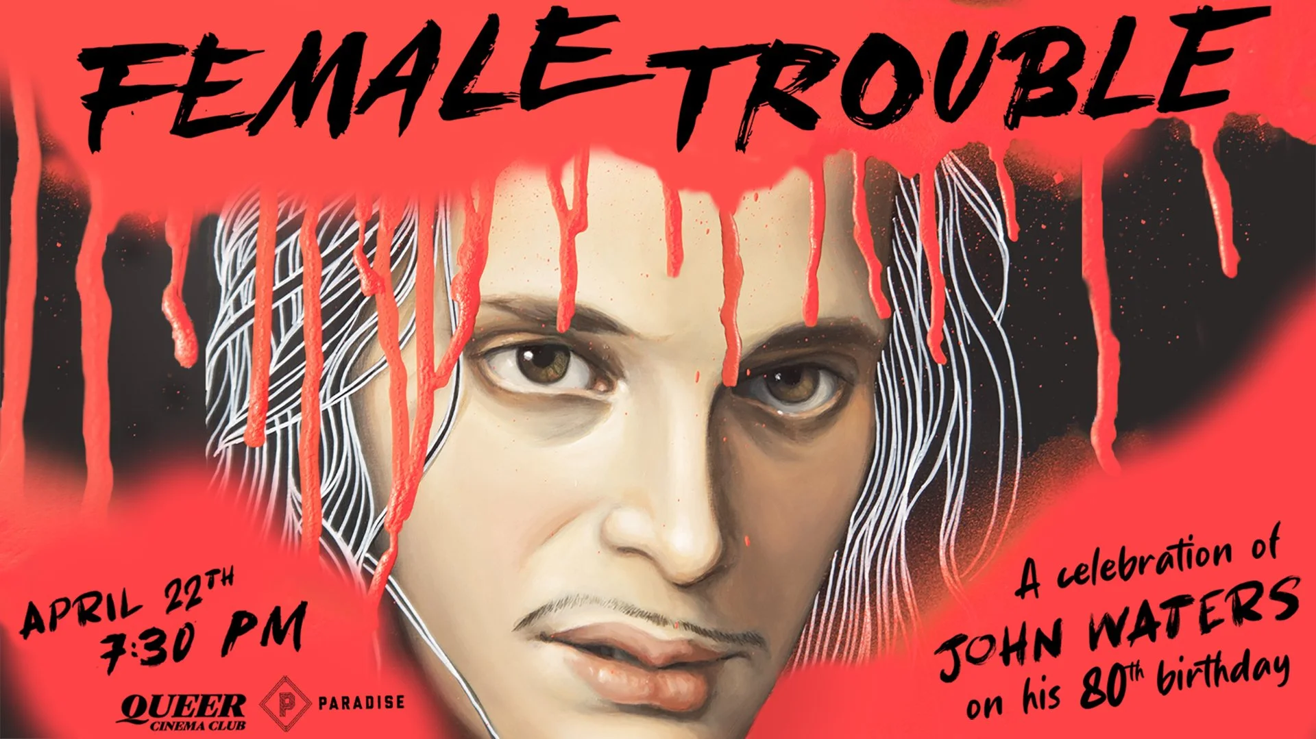 Get your cha cha heels ready! Because we are finally showing the absolute mayhem that is John Waters’s Female Trouble!! And the occasion couldn’t be more apt: not only is April 22nd the 4th anniversary of Queer Cinema Club and our 69th (!) screening, but it’s also John’s 80th birthday!!